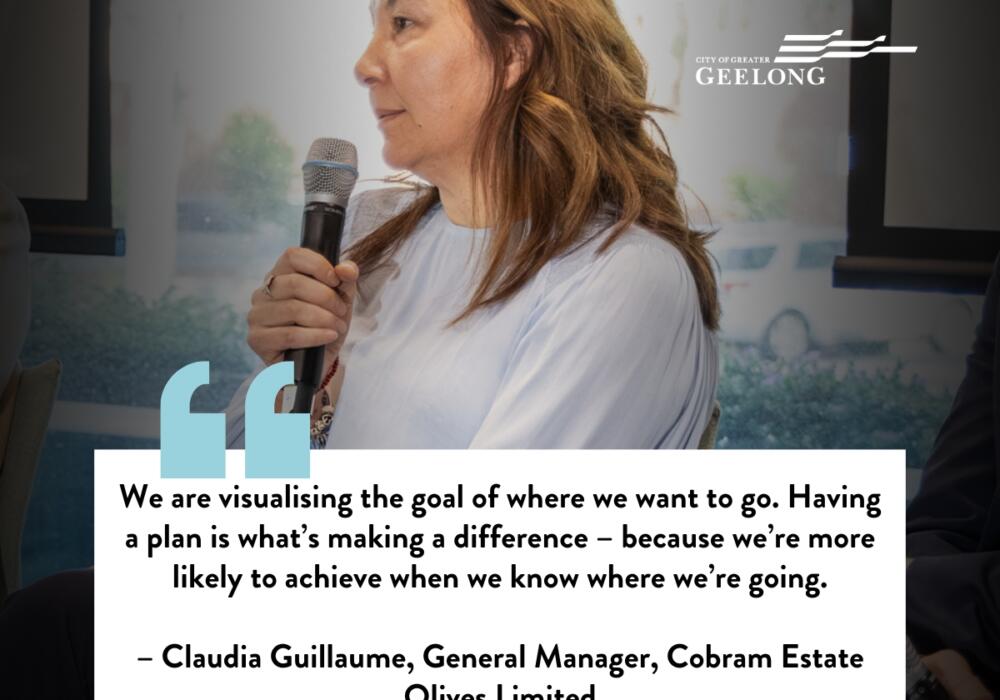 Cobram Estate’s Claudia Guillaume joined our own CEO Jenn Conley, Deakin University’s Vice Chancellor Iain Martin, City CEO Ali Wastie, Barwon Health CEO Frances Driver, and Geelong Gallery CEO Humphrey Clegg on the panel.